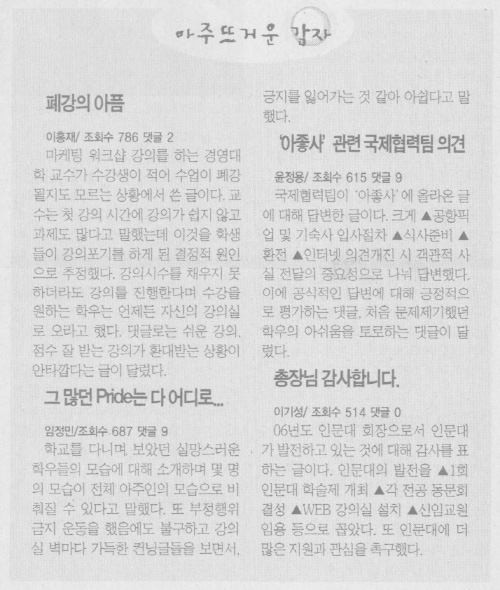 아주대학보 제490호(2008. 3. 17) ‘아좋사’ 관련 국제협력팀 의견